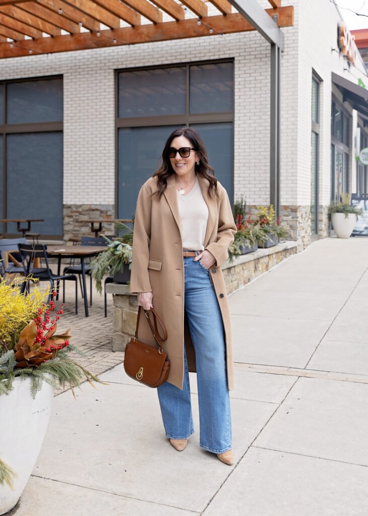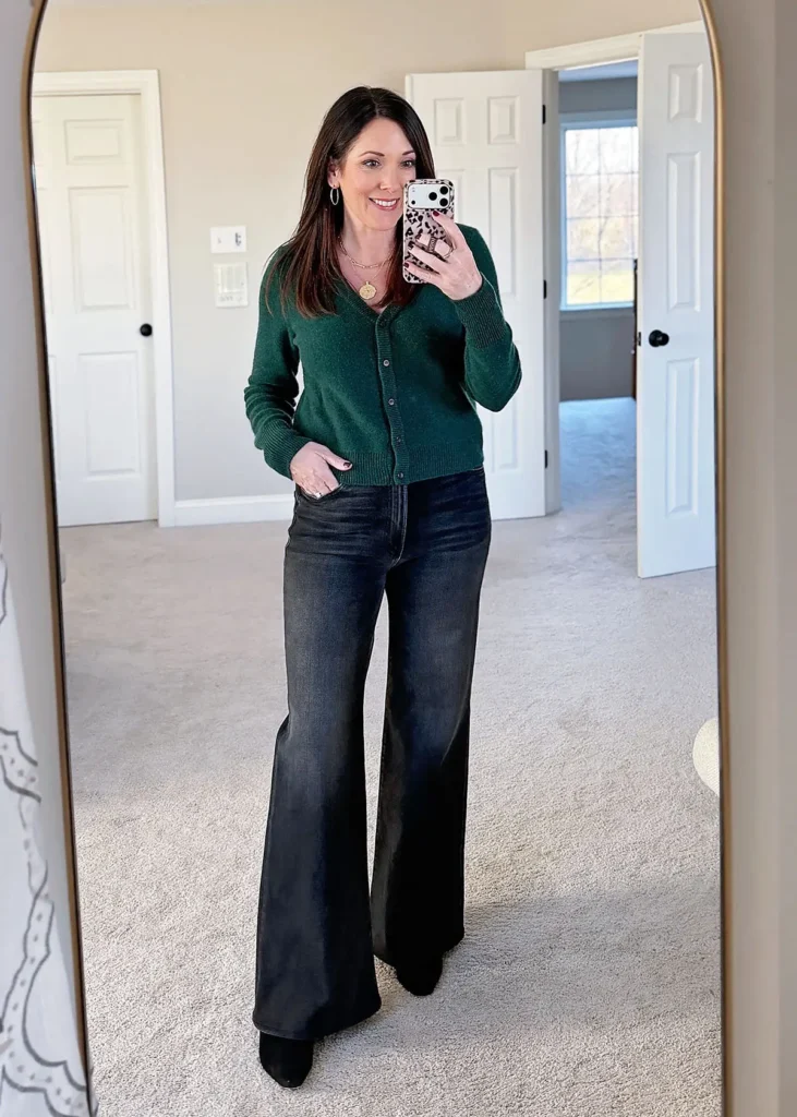 • Wide-leg jeans + structured cardigan + statement jewelry