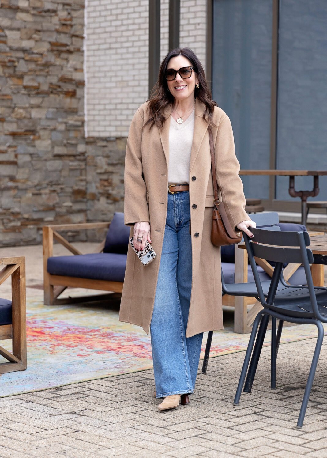 • Wide-leg jeans + structured cardigan + statement jewelry