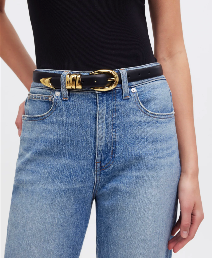 The trend centers on smooth leather belts paired with distinctive hardware, such as oversized buckles, sculptural shapes, or shiny metallic finishes. Double-bar and triple-bar buckles are especially popular, giving simple outfits an instant upgrade.