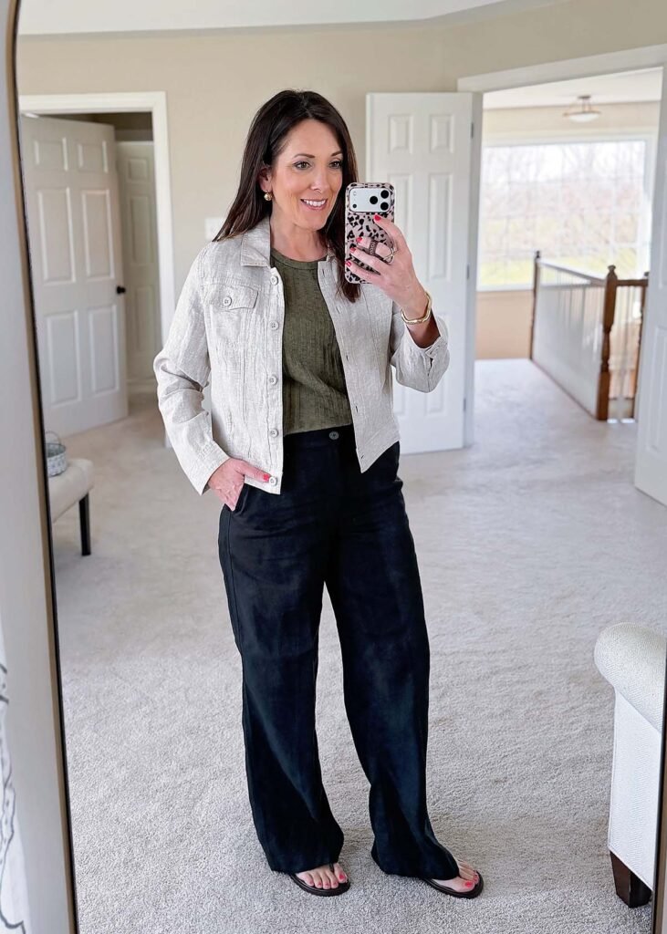 Combining these pieces makes it easy to create outfits that feel fresh and practical for the season. A lightweight jacket layered over a simple tee and paired with linen pants creates an effortless look suitable for errands, casual workdays, or weekend outings.